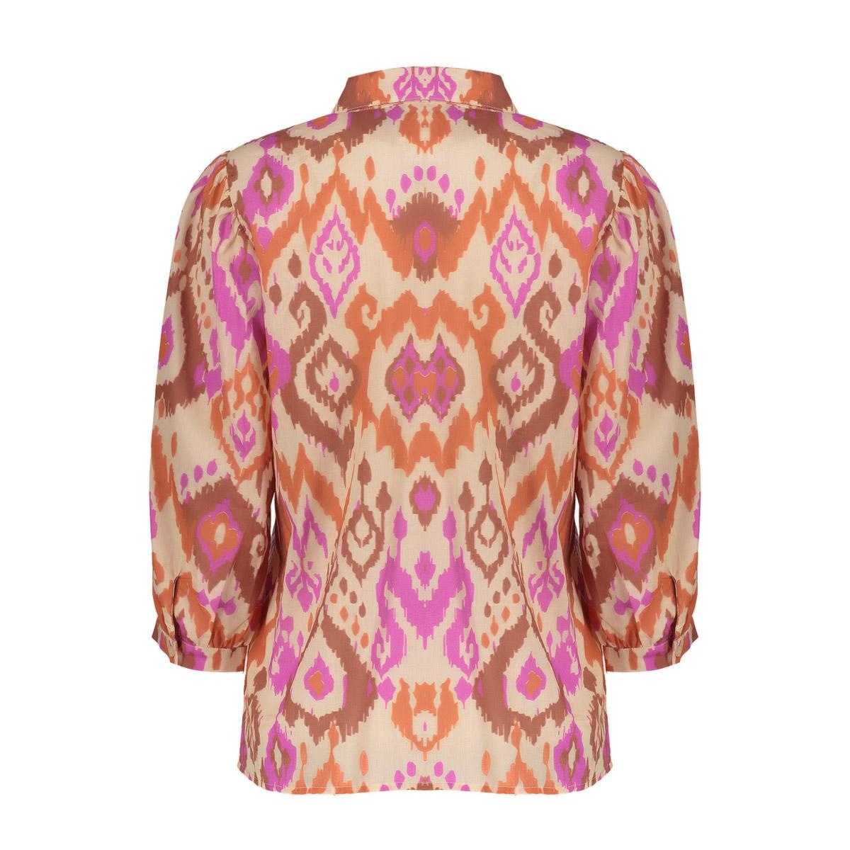 Deze blouse uit onze S26-1 collectie is een echte kleurboost voor je garderobe. De grafische print in roze, oranje en zandtinten geeft een warme, zomerse uitstraling. De klassieke kraag en doorknoopsluiting zorgen voor een tijdloze basis, terwijl de 3/4 mouwen met subtiele volume een vrouwelijke touch toevoegen. Perfect te combineren met een pantalon of denim voor een stijlvolle look.