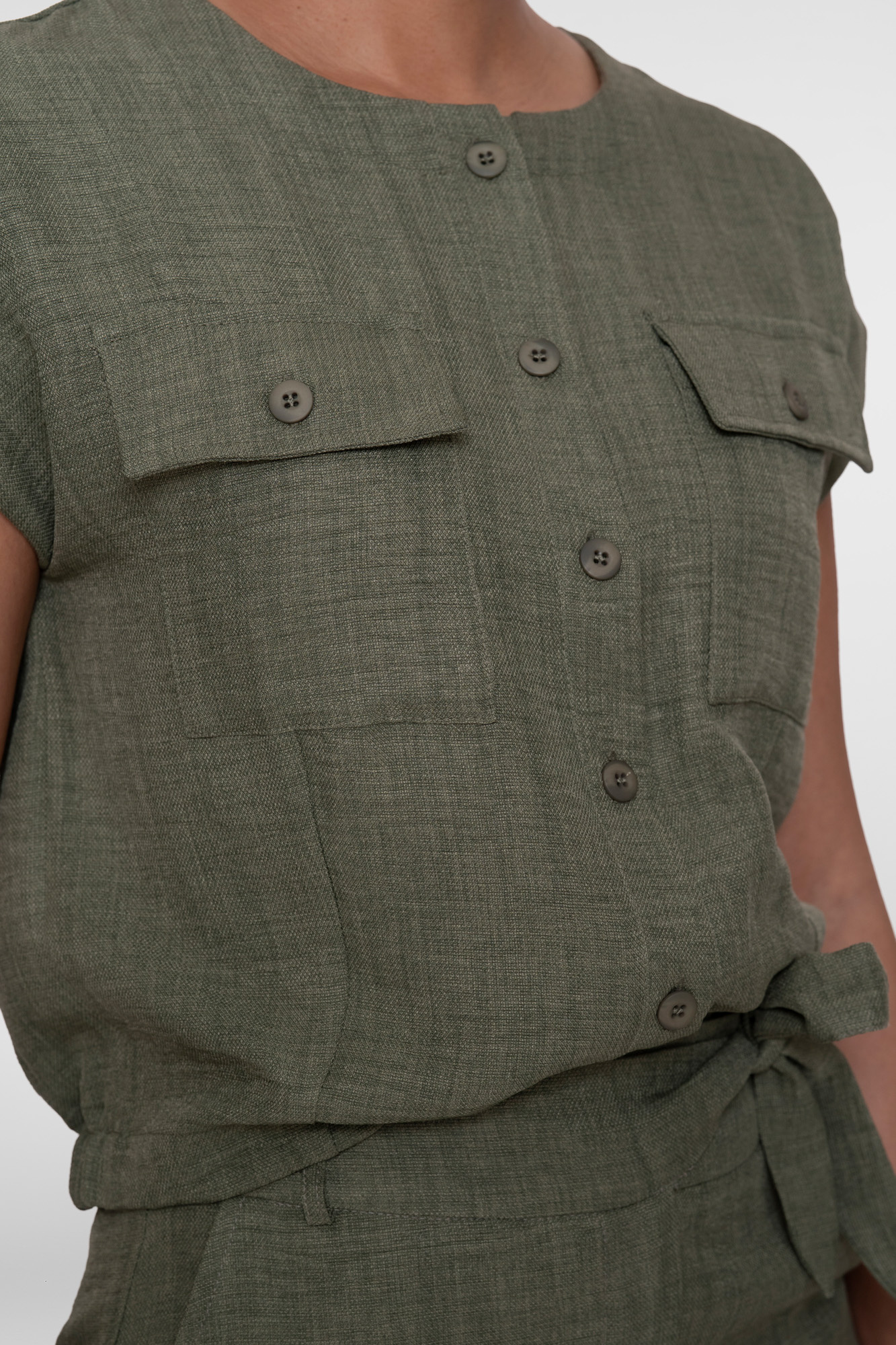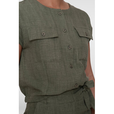 Deze blouse uit onze S26-1 collectie is uitgevoerd in een stof met een rijke linnenachtige look en maakt deel uit van een stijlvolle co-ord set. Het cropped silhouet, de korte mouwen en de subtiele knoopsluiting zorgen voor een moderne uitstraling. De borstzakken en strikdetail in de taille geven de blouse een verfijnde, vrouwelijke touch. Perfect te combineren met de bijpassende broek of los te dragen.