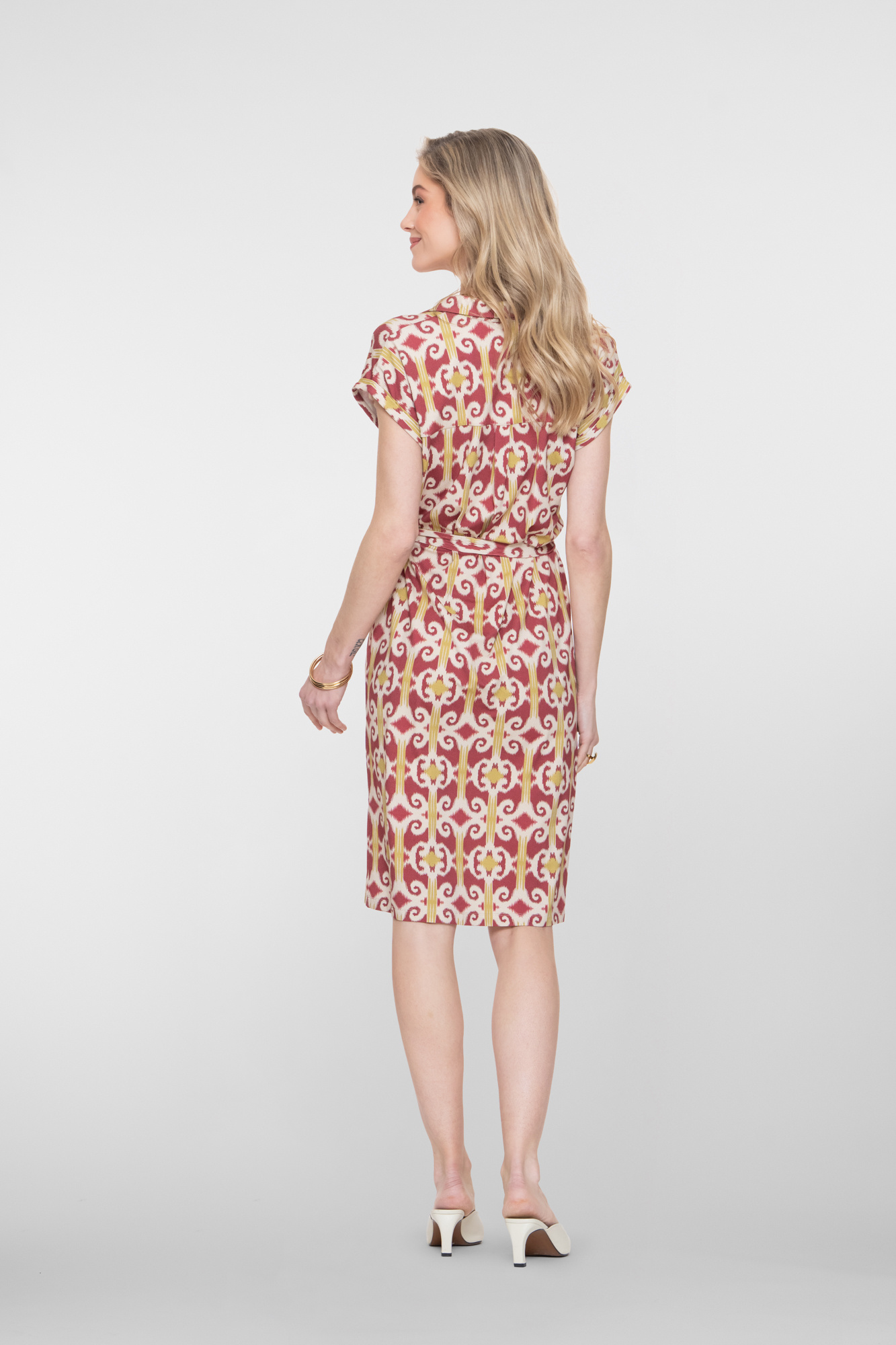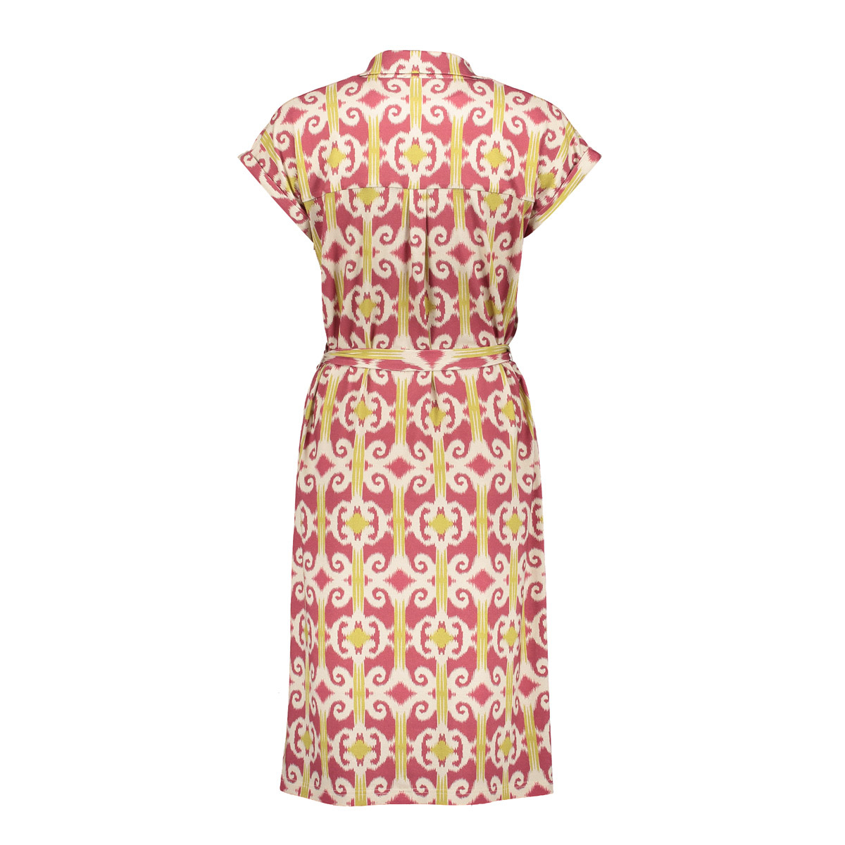 Deze blousejurk valt soepel en krijgt een eigentijdse uitstraling door de grafische ikat-geïnspireerde print in warme tinten. Het karakteristieke dessin geeft de jurk een verfijnde, licht exotische touch. De klassieke kraag en doorknoopsluiting zorgen voor balans, terwijl het strikceintuur de taille mooi accentueert.