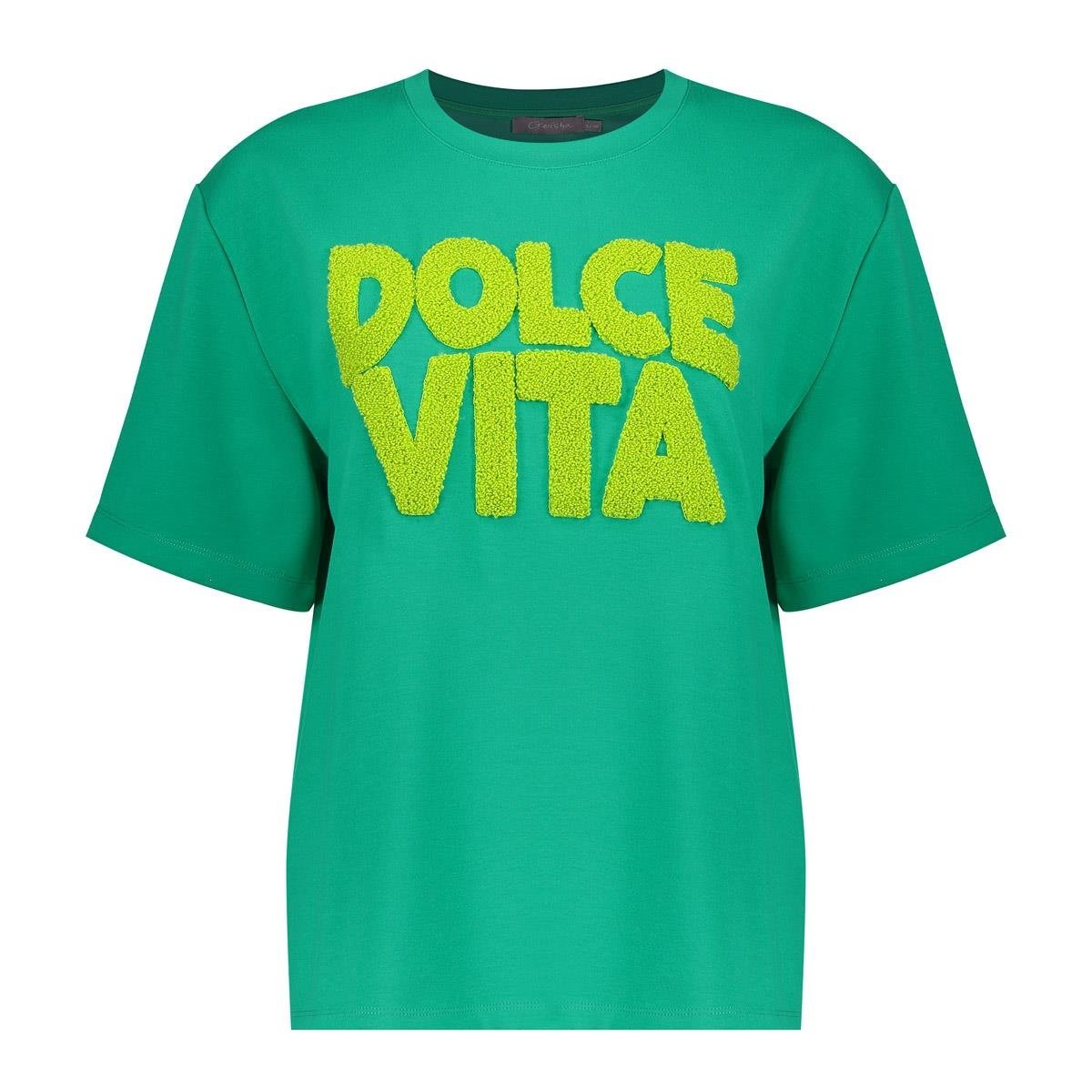 Dit T-shirt uit onze S26-1 collectie is uitgevoerd in subtiel scuba materiaal en heeft een boxy fit. De ronde hals en korte mouwen zorgen voor een sportieve uitstraling, terwijl de badstof Dolce Vita embroidery een speels accent toevoegt.