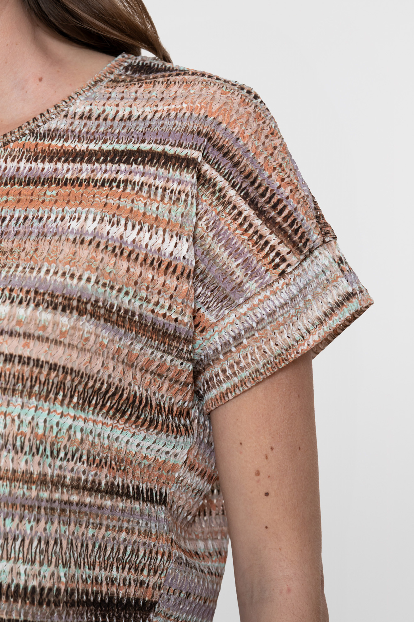 Deze top heeft een luchtige, opengewerkte structuur met een verfijnd streepdessin in meerdere tinten. De lichte see-through geeft een elegante, zomerse uitstraling. Het strikdetail onderaan zorgt voor een vrouwelijke touch en een speelse pasvorm. Mooi te combineren voor een verzorgde, casual look.