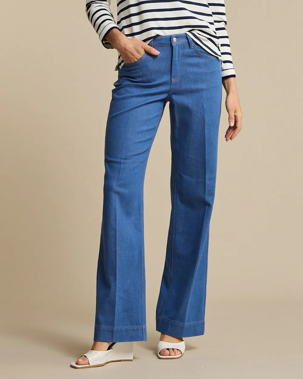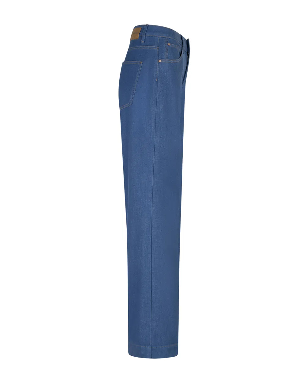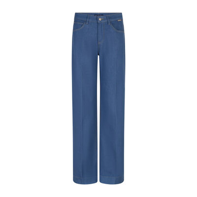 De Claudette Slanted Seam Light Blue is een wide leg broek met schuine naden en een lichtblauwe wassing. De broek is aansluitend op de heup en loopt vanaf het bovenbeen wijd uit. De Claudette Slanted Seam Light Blue heeft een hoge taille en een regular fit.