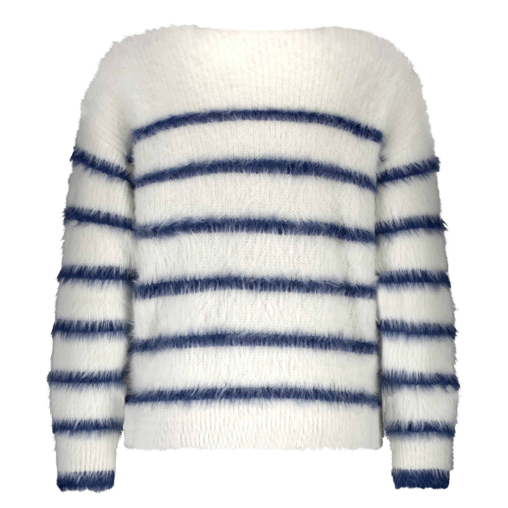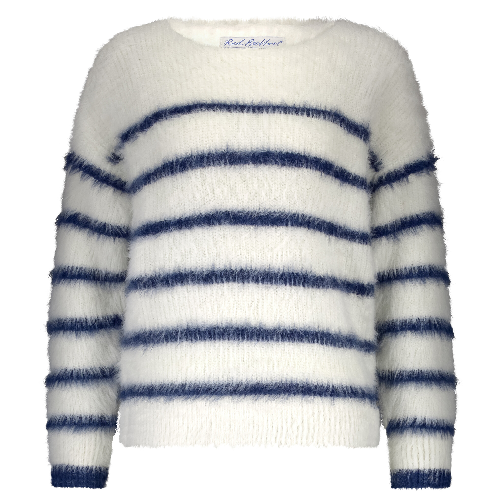 Red Button Fuzzy Sweater & Stripe Ecru Indigo