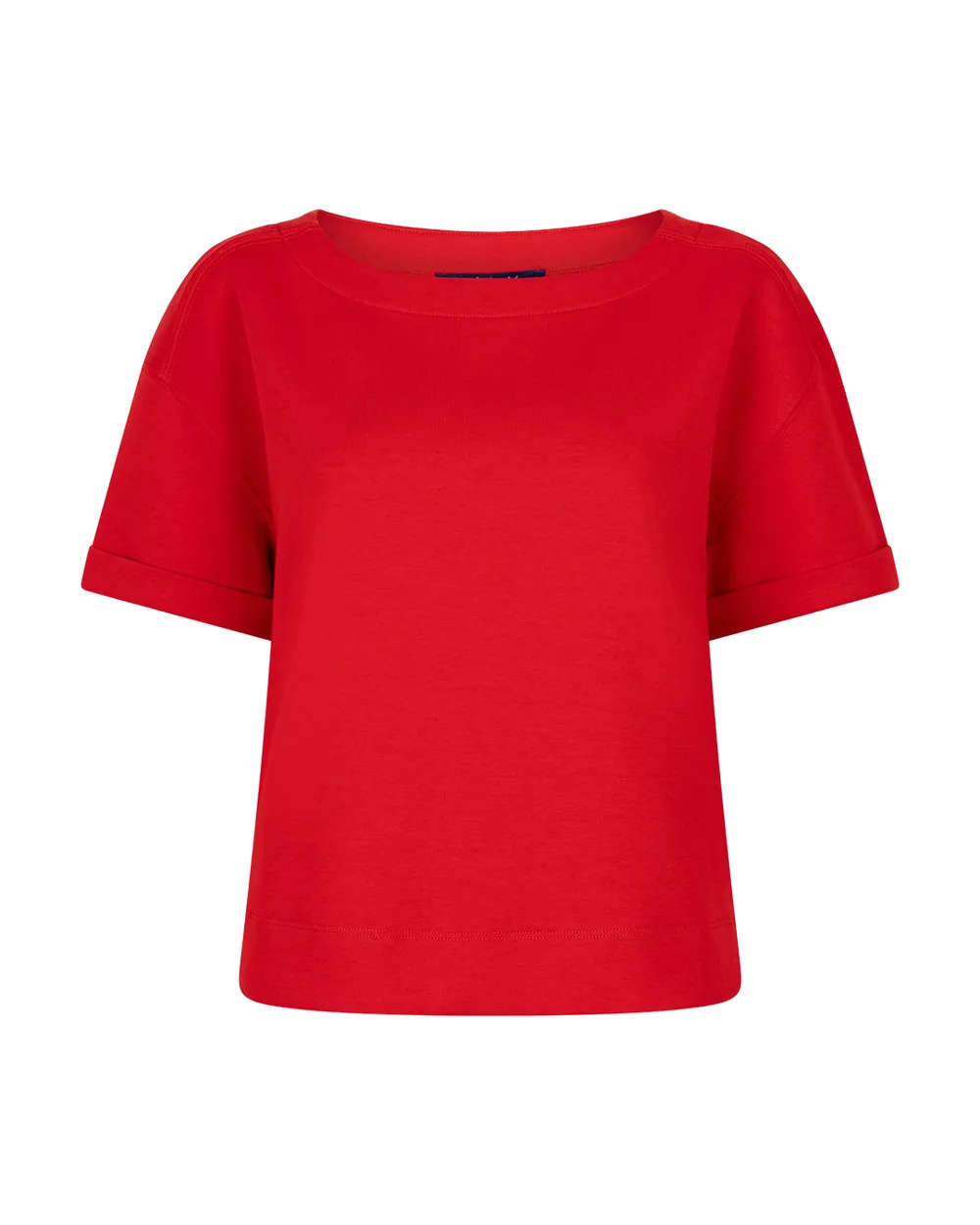 De Skyler Scuba Top heeft een boxy fit, korte mouwen met een omslag en verlaagde schouders. De top heeft een ronde hals en is verkrijgbaar in verschillende kleuren.