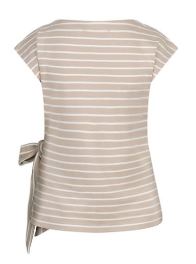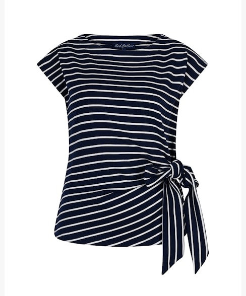 De Terry Stripe With Knot is een top met een strikdetail aan de voorkant. De top heeft een aangeknipte mouw, een ronde hals en horizontale strepen. Met de strik aan de voorkant kan de top getailleerd worden.