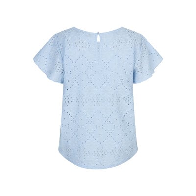 De Top Ajour Ruffle Sleeve is gemaakt van broderie en heeft een ronde hals. De top heeft korte mouwen met ruffles en een druppelvormige opening met een knoop aan de achterkant. De Top Ajour Ruffle Sleeve is verkrijgbaar in verschillende kleuren.