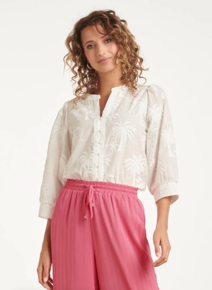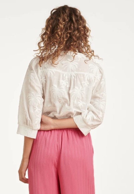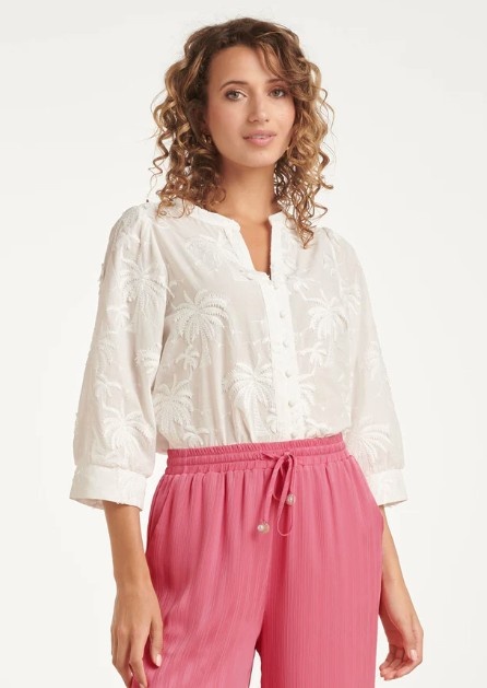 Breng de vakantiestemming in huis met deze zomerse blouse van Smashed Lemon. De blouse is voorzien van een prachtig, voelbaar borduursel in de vorm van palmbomen, wat zorgt voor een unieke en speelse textuur. Met een klassieke knoopsluiting, een V-hals en driekwart mouwen is deze blouse zowel comfortabel als modieus. Perfect te combineren met je favoriete jeans of een luchtige rok. Belangrijkste kenmerken: Uniek geborduurd palmboommotief voor een tropisch effect Klassieke knoopsluiting en comfortabele driekwart mouwen Gemaakt van luchtig materiaal, typisch Smashed Lemon.