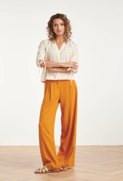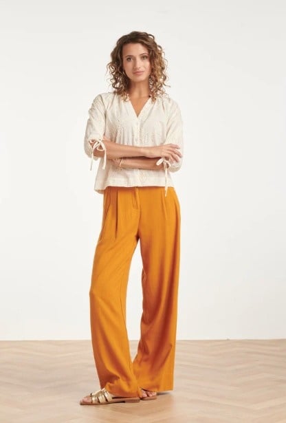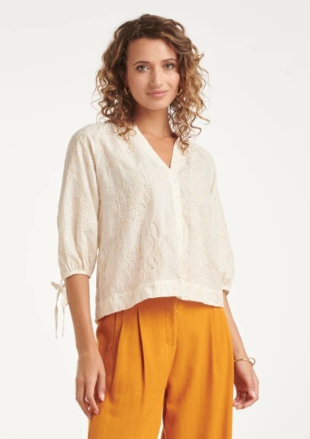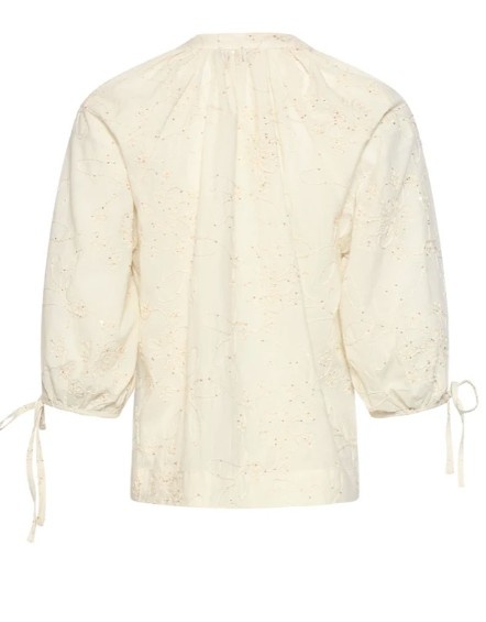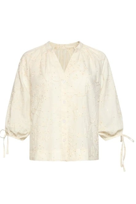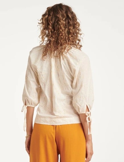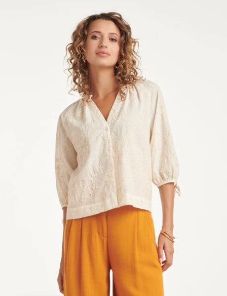 Geef je outfit een romantische touch met deze luchtige blouse van Smashed Lemon. De off-white kleur vormt de perfecte basis voor het verfijnde, opengewerkte borduurwerk. Deze subtiele bloemenprint met kleine details geeft de blouse een vintage, boho-chic uitstraling die nooit uit de mode raakt. De blouse heeft een flatterende V-hals en driekwart mouwen die je naar wens kunt strikken met de koordjes aan de uiteinden. De lichte stof maakt het een ideaal kledingstuk voor warme dagen. Met deze top van Smashed Lemon kies je voor een tijdloze look die zowel elegant als ontspannen aanvoelt. Belangrijkste kenmerken: Verfijnd opengewerkt borduurwerk met een subtiele bloemenprint Driekwart mouwen met verstelbare strikdetails Flatterende V-hals voor een vrouwelijke pasvorm.